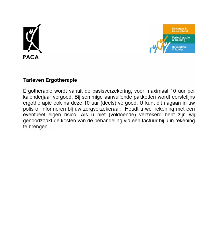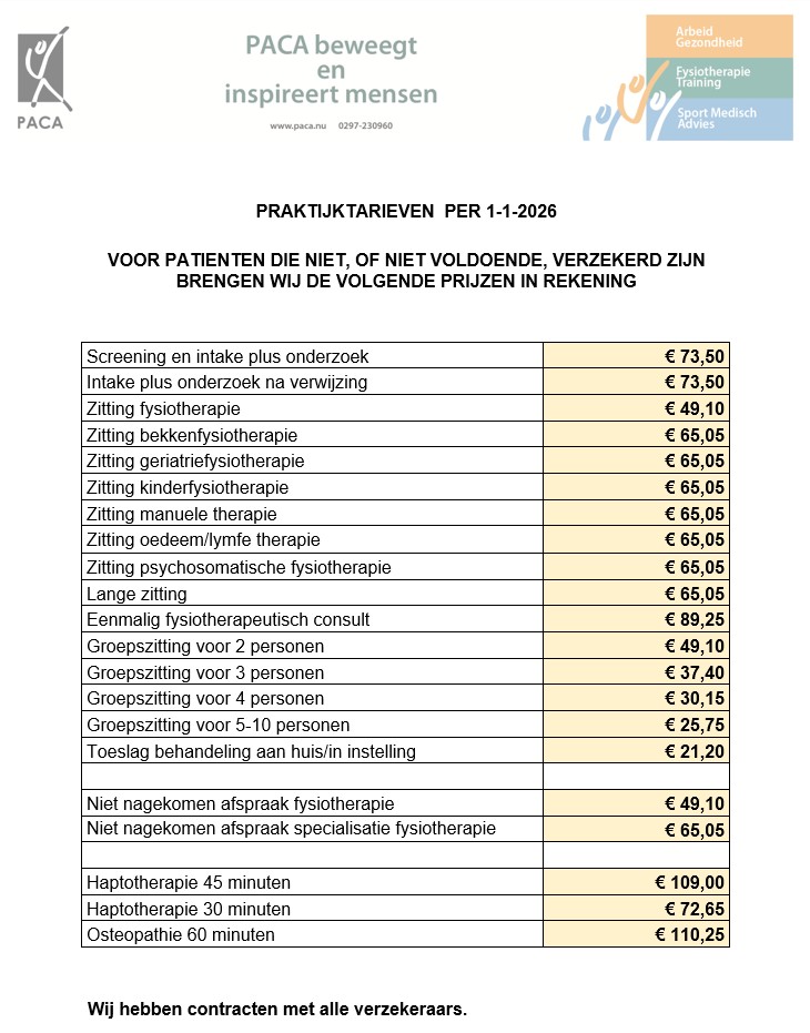 De behandeling kan geheel of gedeeltelijk vergoed worden door uw zorgverzekeraar, maar alleen als u hiervoor verzekerd bent. U kunt dit zelf nagaan in uw polis. (Zie ook Rijksoverheid.nl). U blijft altijd zelf verantwoordelijk voor het betalen van uw rekening, ook als u verzekerd bent. Aan uitspraken van onze medewerkers over uw verzekering kunt u daarom geen rechten ontlenen. Als u niet aanvullend bent verzekerd voor fysiotherapie, zullen wij na de behandeling een factuur sturen zodat u de kosten kunt betalen